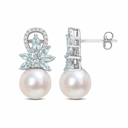Средние характеристики: жемчуг белый, размер: 9.0-9.5 мм, огранка Круг; аквамарин голубой, размер: 5x2.5 мм; 4x2 мм; 2 мм; 1.5 мм; круглый белый бриллиант