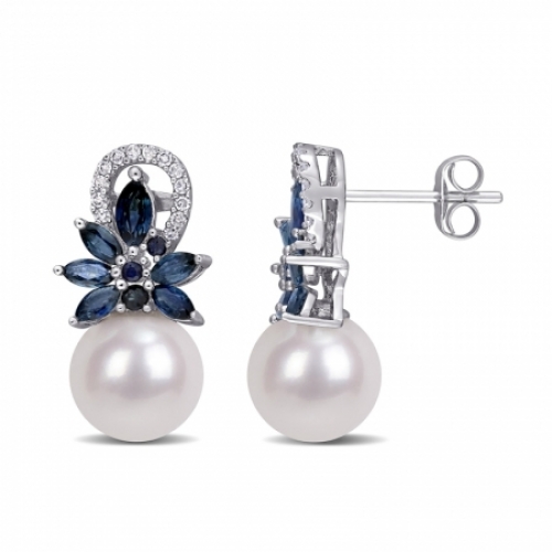 Средние характеристики: жемчуг белый, размер: 9x9.5 мм, огранка Круг; сапфир голубой, размер: 4x2x5x2.5 мм; круглый белый бриллиант
