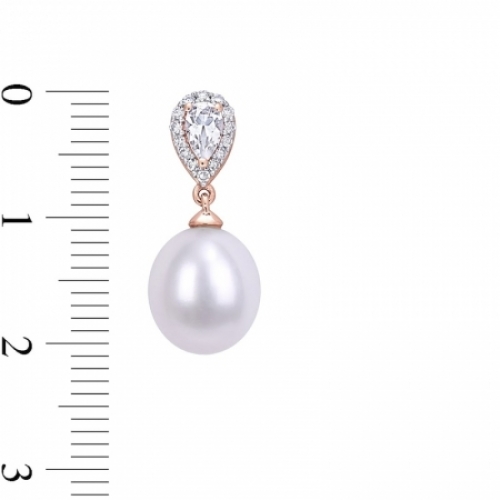 Средние характеристики: жемчуг белый, размер: 9.0-9.5 мм; топаз белый, размер: 5x3 мм, огранка Груша; круглый белый бриллиант