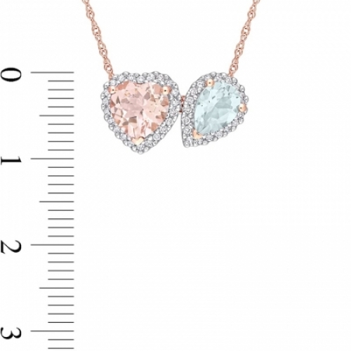 Средние характеристики: морганит розовый, размер: 7 мм, огранка Сердце; аквамарин голубой, размер: 7x5 мм, огранка Груша; круглый белый бриллиант