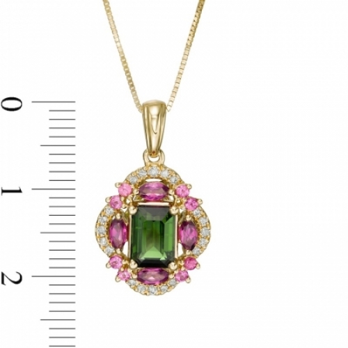 Средние характеристики: турмалин зеленый, размер: 7x5 мм, огранка Октагон; фиолетовый гранат, размер: 4x2 мм; круглый белый бриллиант