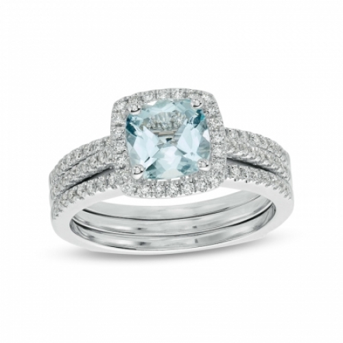 Средние характеристики: аквамарин голубой, размер: 7 мм, огранка Кушон (подушка); круглый бриллиант