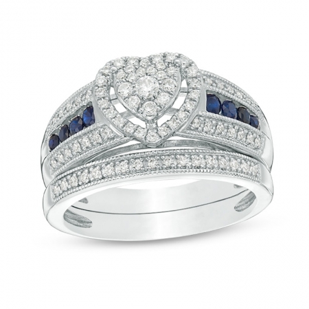 Комплект колец из белого золота 585 пробы с сапфиром и бриллиантами