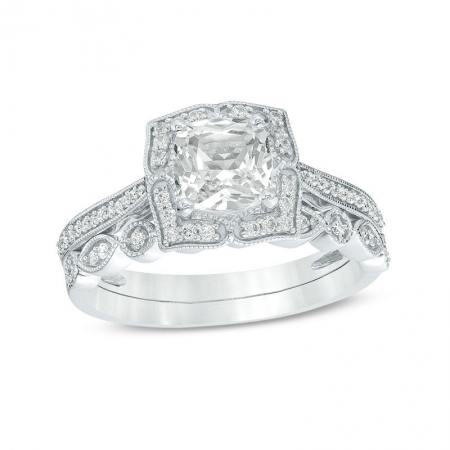 Средние характеристики: белый сапфир гт, размер: 6 мм, огранка Кушон (подушка); круглый бриллиант