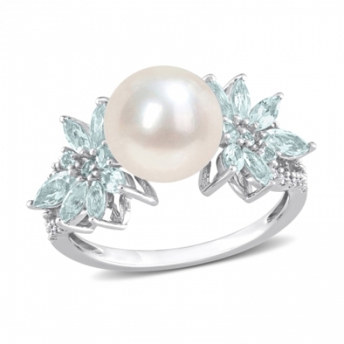 Средние характеристики: жемчуг белый, размер: 9.0-9.5 мм, огранка Круг; аквамарин голубой, размер: 5x2.5 мм; 4x2 мм; 2 мм; 1.5 мм; круглый белый бриллиант