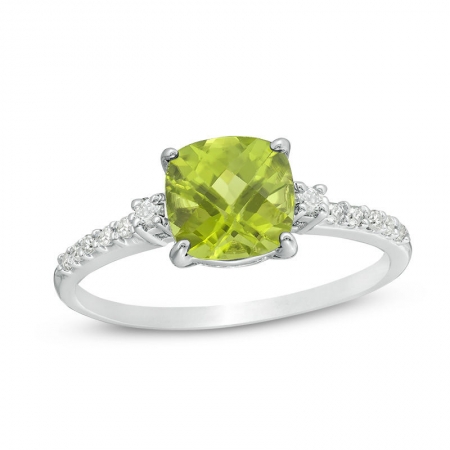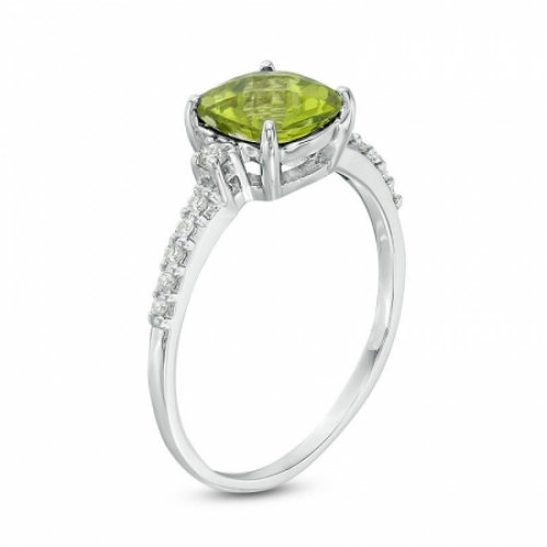 Средние характеристики: перидот зеленый, размер: 7 мм, огранка Кушон (подушка); круглый бриллиант