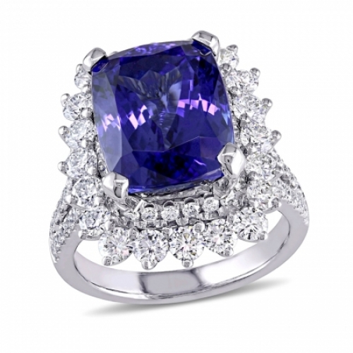 Средние характеристики: танзанит голубой, размер: 11.28x9.54 мм, огранка Кушон (подушка); круглый бриллиант