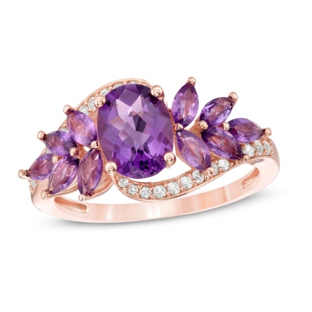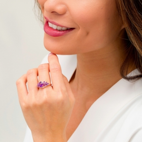 Средние характеристики: аметист фиолетовый, размер: 8x6 мм, огранка Овал; аметист, размер: 4x2 мм, огранка Маркиз; круглый белый бриллиант