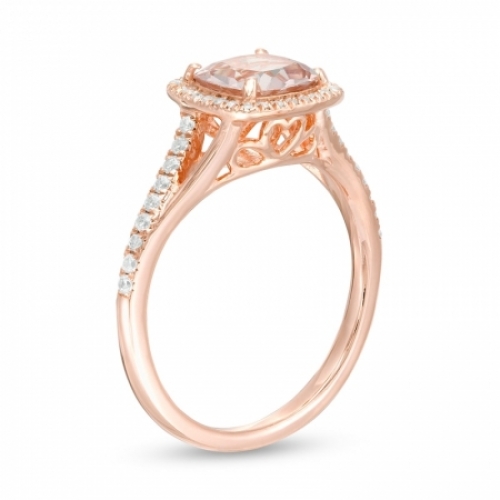 Средние характеристики: морганит розовый, размер: 7 мм, огранка Кушон (подушка); круглый бриллиант