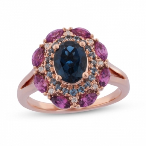 Средние характеристики: топаз голубой, размер: 8x6 мм; фиолетовый гранат, размер: 4x2 мм, огранка Маркиз; круглый белый бриллиант