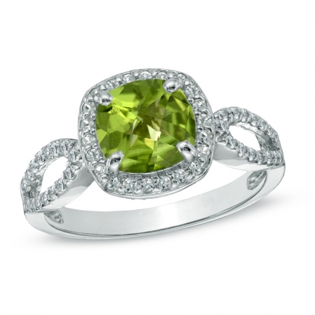 Средние характеристики: перидот зеленый, размер: 7 мм, огранка Кушон (подушка); белый сапфир гт, размер: 1.5 мм, огранка Круг