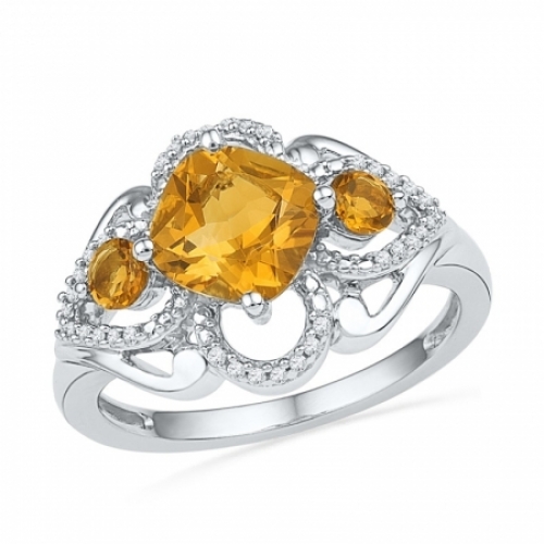 Средние характеристики: цитрин желтый, размер: 7.0-3 мм, огранка Кушон (подушка); круглый бриллиант