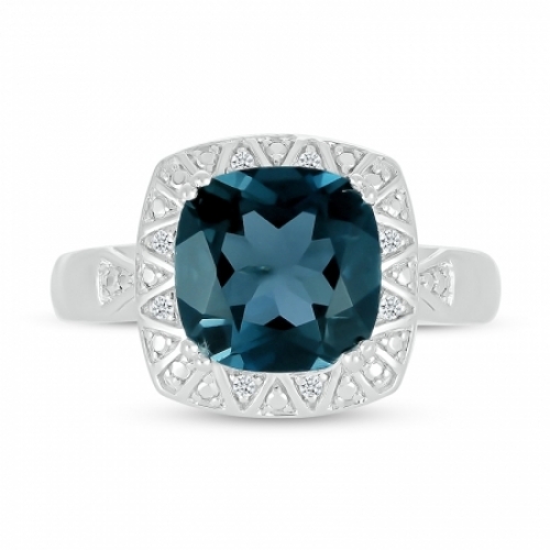 Средние характеристики: топаз голубой, размер: 9 мм, огранка Кушон (подушка); круглый бриллиант