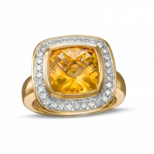 Средние характеристики: цитрин желтый, размер: 10 мм, огранка Кушон (подушка); круглый бриллиант