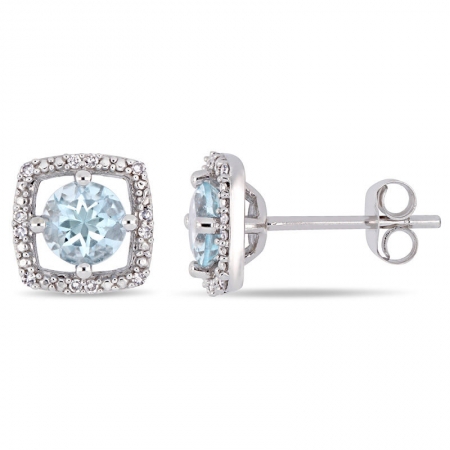 Серьги-гвоздики из белого золота 585 пробы с аквамарином и бриллиантом