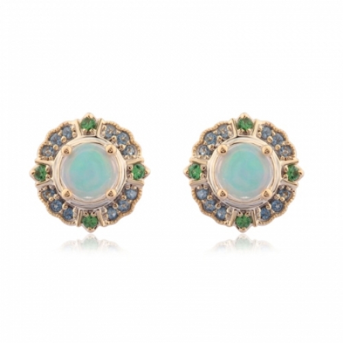 Серьги-гвоздики из красного золота 585 пробы с опалом, топазами и цаворитом