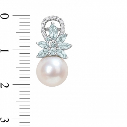 Средние характеристики: жемчуг белый, размер: 9.0-9.5 мм, огранка Круг; аквамарин голубой, размер: 5x2.5 мм; 4x2 мм; 2 мм; 1.5 мм; круглый белый бриллиант