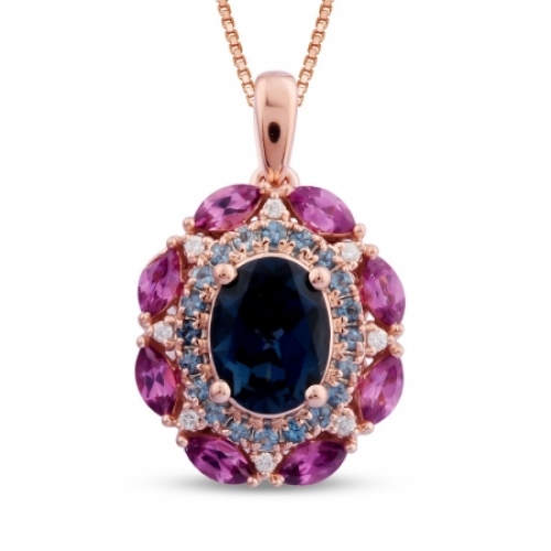 Средние характеристики: топаз голубой, размер: 8x6 мм; фиолетовый гранат, размер: 4x2 мм, огранка Маркиз; круглый белый бриллиант