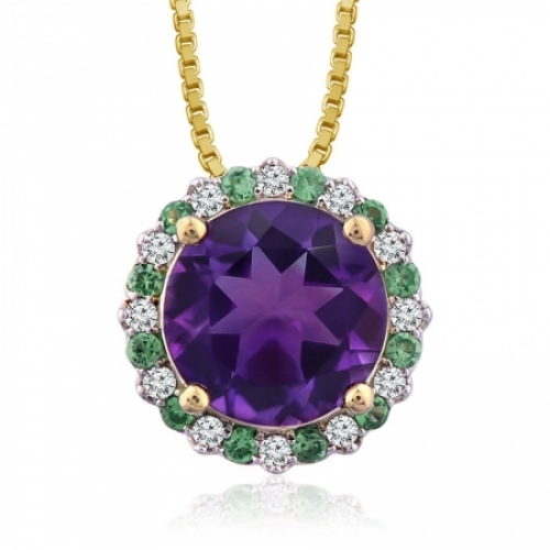 Средние характеристики: аметист фиолетовый диаметром 10 мм, огранка Круг; зеленый цаворит, размер: 1.5 мм, огранка Круг; круглый белый бриллиант