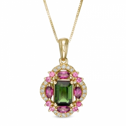 Средние характеристики: турмалин зеленый, размер: 7x5 мм, огранка Октагон; фиолетовый гранат, размер: 4x2 мм; круглый белый бриллиант