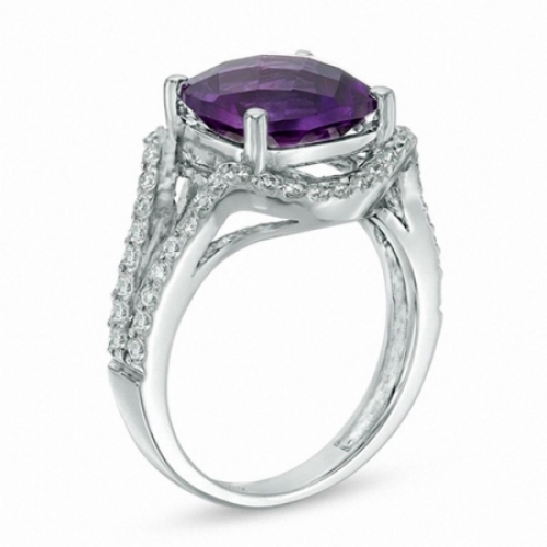 Средние характеристики: аметист фиолетовый, размер: 10 мм, огранка Кушон (подушка); бриллиант, размер: 10 мм, огранка Круг