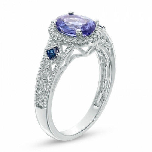 Средние характеристики: танзанит голубой, размер: 8x6 мм, огранка Овал; сапфир голубой, размер: 2 мм, огранка Квадрат; круглый белый бриллиант