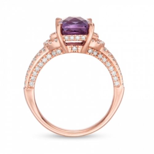 Средние характеристики: аметист фиолетовый, размер: 9x7 мм, огранка Октагон; бриллиант, огранка Багет; круглый белый бриллиант