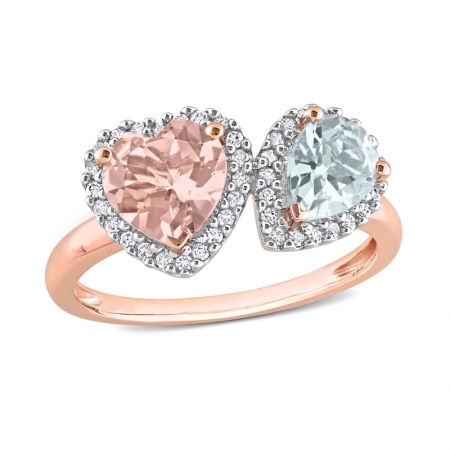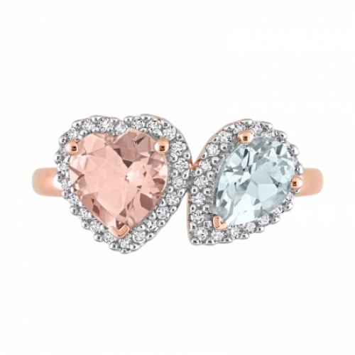 Средние характеристики: морганит розовый, размер: 7 мм, огранка Сердце; аквамарин голубой, размер: 7x5 мм, огранка Груша; круглый белый бриллиант