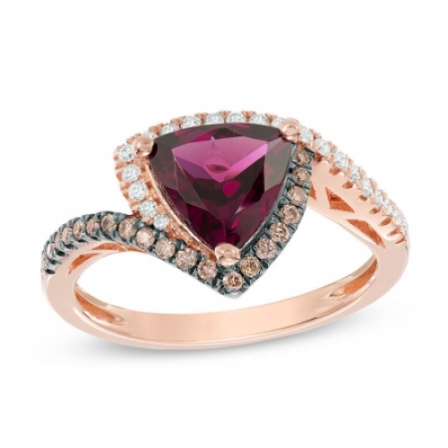 Средние характеристики: родолит розовый, размер: 8 мм, огранка Триллион; бриллиант шампань, огранка Круг; круглый белый бриллиант