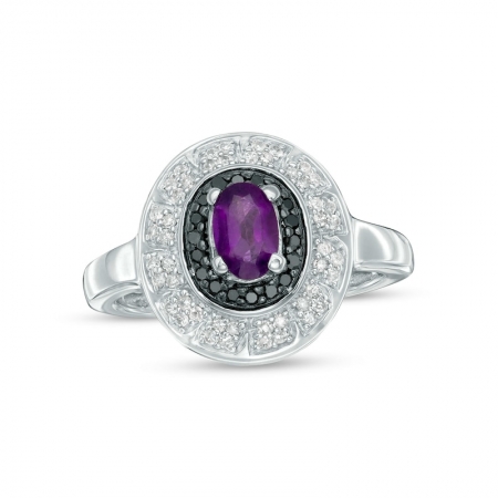 Средние характеристики: аметист фиолетовый, размер: 6x4 мм, огранка Овал; круглый черный бриллиант; круглый белый бриллиант