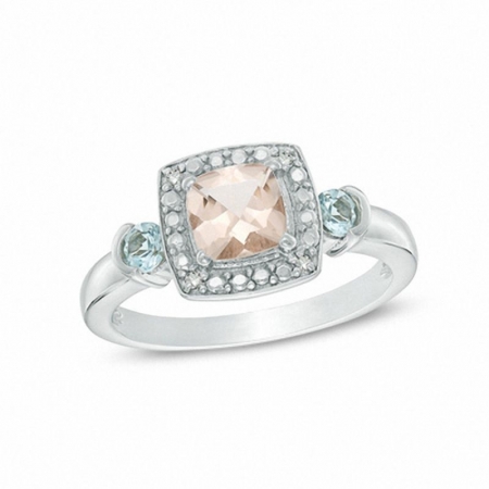 Средние характеристики: морганит розовый, размер: 6 мм, огранка Кушон (подушка); аквамарин голубой, размер: 3 мм, огранка Круг; круглый белый бриллиант