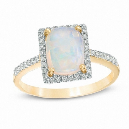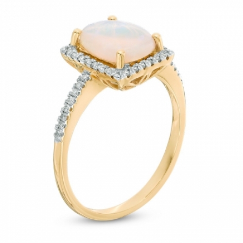 Средние характеристики: опал белый, размер: 9x7 мм, огранка Кушон (подушка); круглый бриллиант